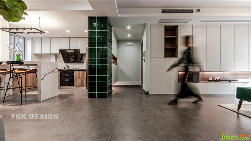 因?yàn)槠綍r(shí)業(yè)主一家三口在吧臺上就可以解決三餐問題,如果有客人來,上海裝修設(shè)計(jì)暗藏在客廳定制柜里面的折疊餐桌就可以派上用場,放在過道中間,尺寸都是預(yù)留好的哦。