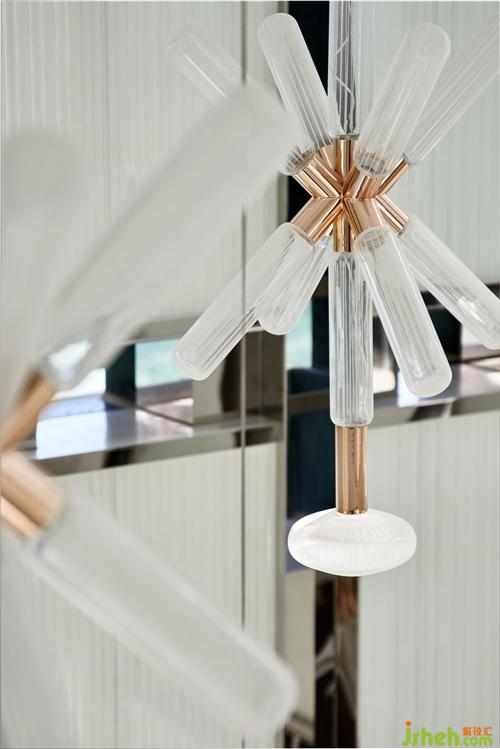 與以往的封閉式玄關(guān)不同,設(shè)計師利用鏡面金屬與鏤空設(shè)計,結(jié)合超高挑空,打造出一個光與影錯綜復(fù)雜的空間。設(shè)計圓弧型吊頂搭配星光式的吊燈,當(dāng)早晨陽光照進玄關(guān),甚至一番美景。