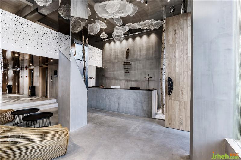 我們通過(guò)材料和造型的運(yùn)用,在空間中營(yíng)造出了天空、海洋、森林、湖泊等場(chǎng)景。酒店前廳放置的白樺樹(shù)和網(wǎng)狀云朵吊飾描繪了一個(gè)森林仙境;油蠟皮包裹的前臺(tái)以及七彩毛線裝飾的窗口,在極簡(jiǎn)的空間里起到提升空間品質(zhì)的作用;通往客房的通道鋪設(shè)了漸變色彩的地毯猶如沙灘海洋;天花和墻面布置了鋁板雕刻led燈宛若浩瀚星空和宇宙塵埃。在每一間客房?jī)?nèi)我們都放置了一顆橡樹(shù),讓自然的力量在空間里散發(fā)生長(zhǎng)。