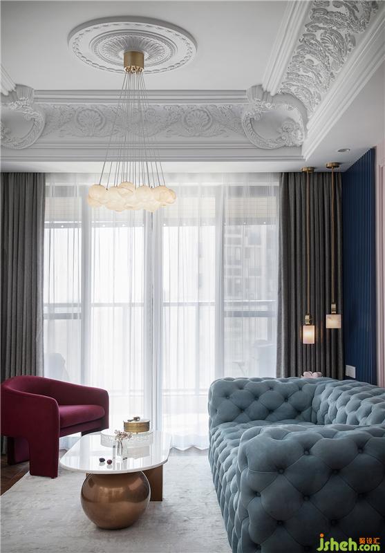 步入室內(nèi),家居設(shè)計(jì)中特色拼花地磚過(guò)渡為魚(yú)骨拼木地板,巧妙地實(shí)現(xiàn)功能分區(qū),讓人眼前一亮,極具儀式感。巖板餐桌在幾何纏繞式吊燈的照射下,更顯輕奢的高級(jí)質(zhì)感,搭配鏤空造型的天鵝絨餐椅,使得室內(nèi)剛中帶柔,恰到好處。