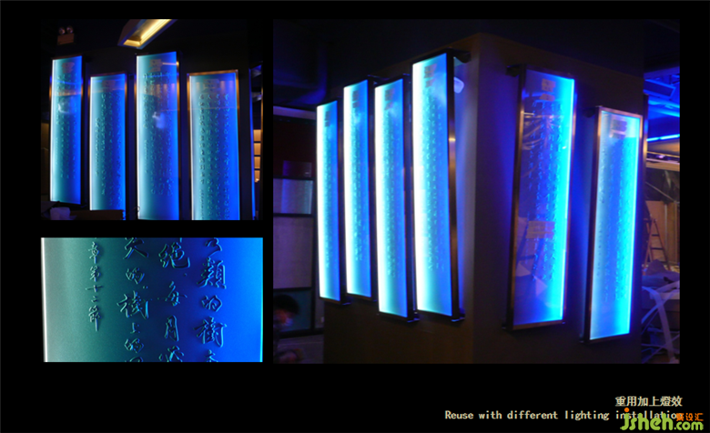 改造前有八塊玻璃畫上有燈光,但是會(huì)產(chǎn)生燈光相互相撞的弊端,燈光變得像在互相打架,燈光大小不一,無法聚焦。而改造后,直接利用外界的自然光,早上太陽的采光會(huì)溫柔一點(diǎn),光投過透明的物體會(huì)直接穿透,上下采用射燈而不放LED,是可以使燈光透射得更遠(yuǎn)。休息房燈光的顏色也可以轉(zhuǎn)換,有彩色玻璃,每塊玻璃都是不同的顏色,每種顏色都代表著香港的不同區(qū)域。