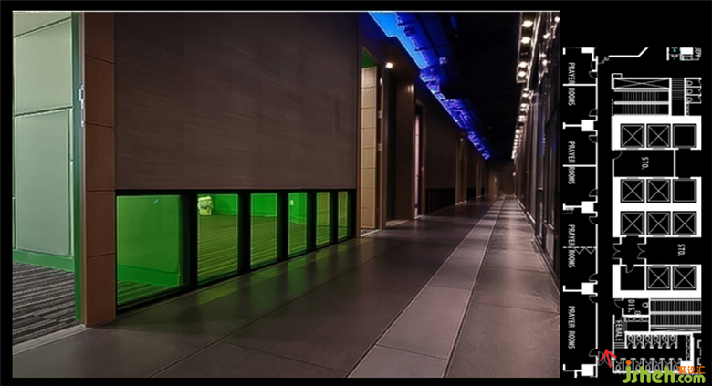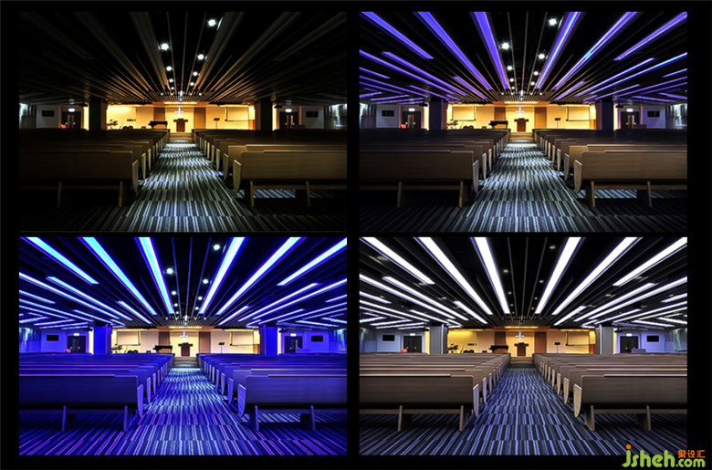 十字架的造型,其中一個(gè)面是凹進(jìn)去,左上用白光,右下用藍(lán)光,使得十字架里面的石頭更加具有立體感,讓這個(gè)位置變成一個(gè)景。教堂的過道兩邊各有六塊玻璃,上面刻上一些文字,玻璃背后用LED白燈和藍(lán)燈,使得玻璃上的文字可以凸顯出來,不需要靠的很近也能看清楚上面的文字。教堂位置選用的是條行地毯,對應(yīng)頂上的燈光,換不一樣顏色的燈光地毯也會(huì)相對應(yīng)的改變顏色。