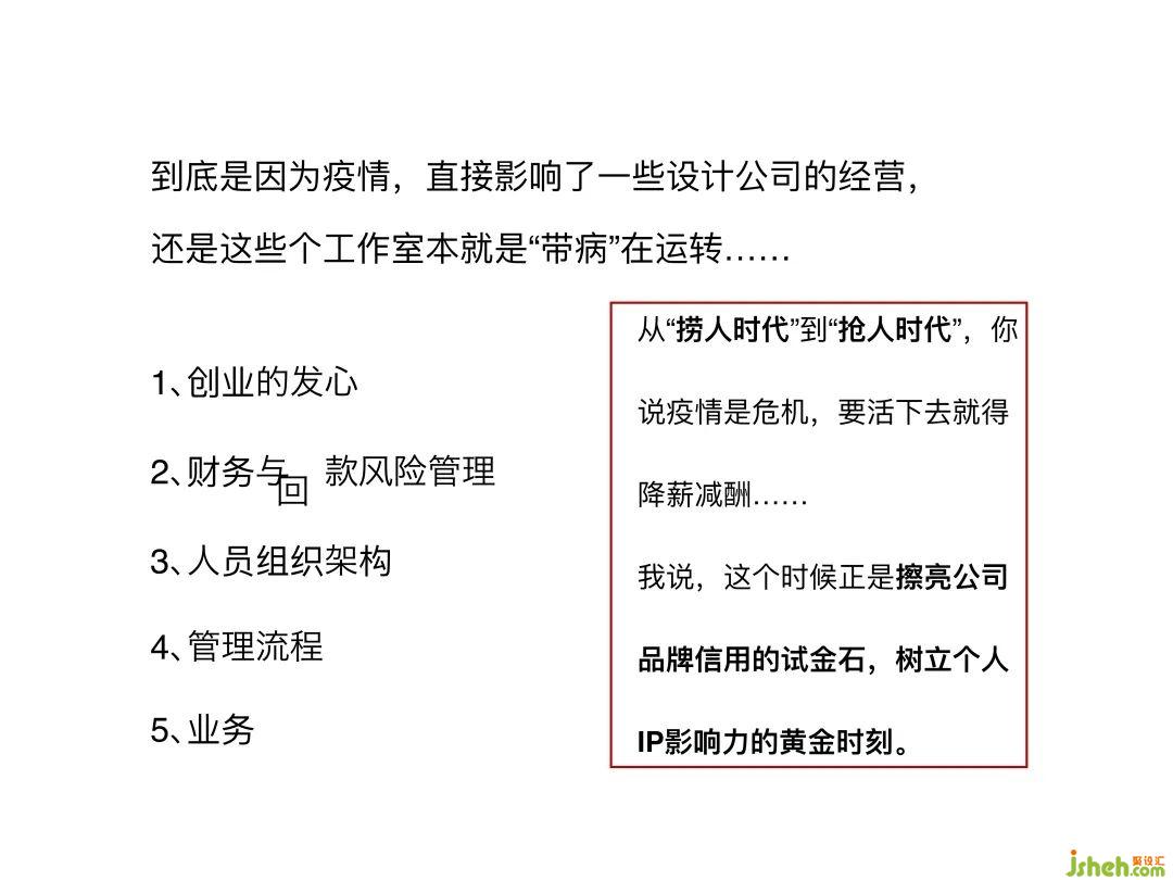 疫情是一面鏡子,一個(gè)公司經(jīng)營得好與壞也是一面鏡子,它能夠反映出經(jīng)營者的心態(tài)。其實(shí)不是因?yàn)橐咔橛绊懥艘恍┰O(shè)計(jì)公司的經(jīng)營,而是這些工作室本就是“帶病”在運(yùn)轉(zhuǎn)。