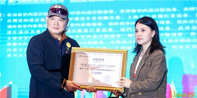 澳門國際設計聯(lián)合會 符軍會長為PINKI EDU品伊國際創(chuàng)意美學教育中心 梁毅飛女士頒發(fā)支持單位牌匾。