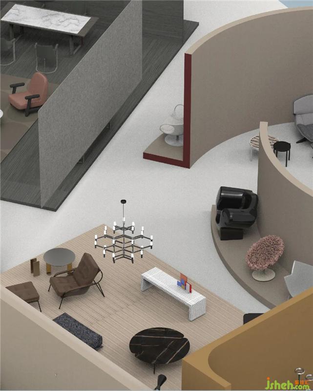 瑞士的USM以色彩豐富的模塊化家具系統(tǒng)而聞名,我們用模塊化的形式構(gòu)建結(jié)構(gòu)空間,將USM的家具融入其中,集產(chǎn)品的展示、體驗(yàn)和功能于一體;意大利新銳設(shè)計(jì)品牌Qeeboo充滿想象力和藝術(shù)性,我們?yōu)槠浯罱▓A形階梯劇場,結(jié)合道具裝飾,讓產(chǎn)品的趣味性更好地呈現(xiàn)。