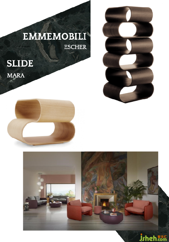 此外,還有一個(gè)重要趨勢(shì),即現(xiàn)在很多材料都具有多變的特征,比如木材可以被加工成像玻璃一樣有透光效果的材質(zhì),還可以被處理成像紙一樣可以彎曲的材質(zhì),或者可以被處理成多種顏色。來自Emmemobili的Escher木質(zhì)邊桌展示了極致的木材彎曲工藝,而來自Slide的一款雙人沙發(fā)Mara看起來像是皮革,實(shí)際是用塑料制成,坐感硬朗,是結(jié)合了皮質(zhì)及塑料的特征從而設(shè)計(jì)出一款新穎獨(dú)特的產(chǎn)品。