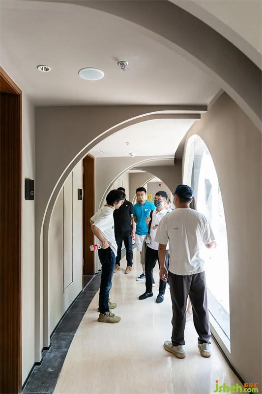 在走廊的設(shè)計(jì)上,Josh團(tuán)隊(duì)參考了中世紀(jì)的歐洲教堂風(fēng)格,除去了哥特式拱頂?shù)哪且环菁饫?,留下柔和的圓弧曲線回環(huán)往復(fù),交錯(cuò)相向。