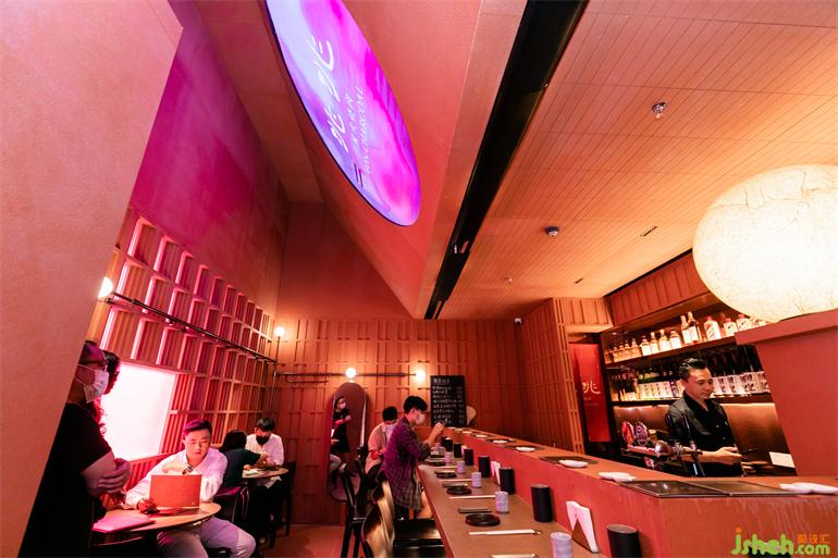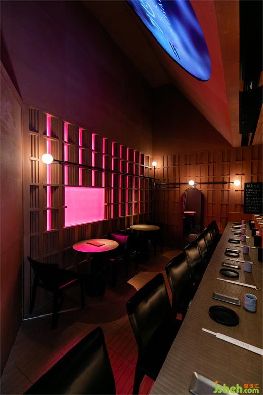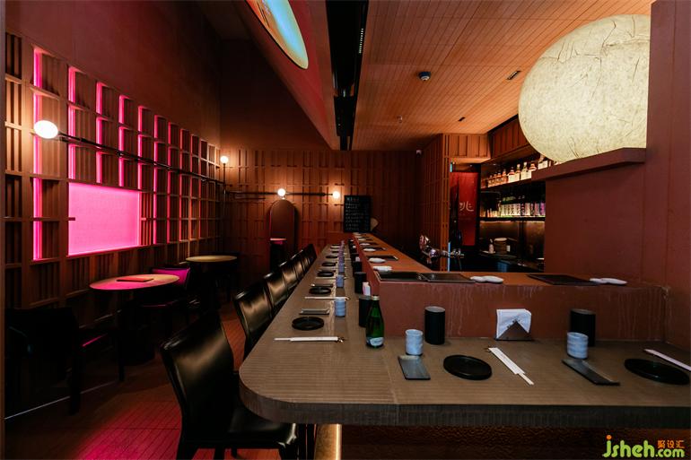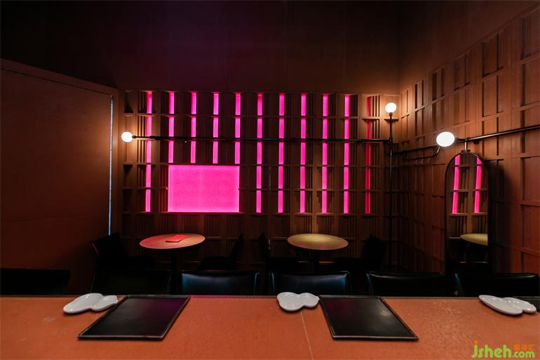 這餐廳空間狹小,共12個餐位,吧臺像一把簡單精致直角扳手,長柄處坐6個人,拐個角,短的一頭設(shè)兩個餐位。外立面墻中間有一個玻璃窗戶,窗戶底下左右兩張桌子,4個餐位。白天光打進來薄薄一層鋪在25%透明度的玻璃上,像粉紅色的霧。晚上的模樣我們不知道,可夜色撩人,霧色應(yīng)更濃。