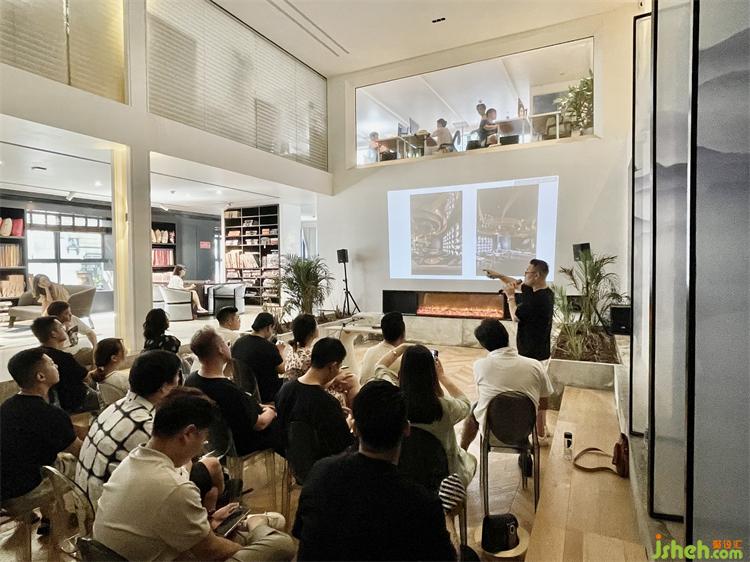 在和陳熠老師短短幾個小時的交流中,不難看出他是一個從精神到靈魂都需要找尋知己的人,不需要過多話語,同頻的人自會和你產(chǎn)生靈魂層面的共振。陳熠老師以他的作品《保利二十四院》為例和在座的青年設(shè)計師一起探討了如何實(shí)現(xiàn)地下空間的使用率和提升舒適度,他大膽“實(shí)驗”,將天井玻璃改造為魚池,水波紋和魚的影子如同天然形成的動態(tài)水墨畫,與室內(nèi)融為一體,一切都顯得那么自然又充滿了禪意。