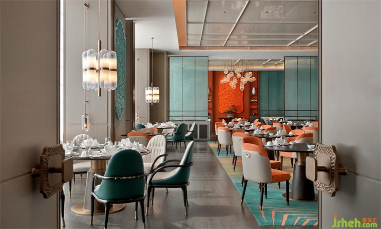希爾頓酒店設(shè)計(jì)中餐廳入口接待出的背景墻一幅由嶺南鑊耳墻特色建筑抽象而成的藝術(shù)畫(huà)。取名「青雅」的中餐廳,意在營(yíng)造「琴棋書(shū)畫(huà),鳥(niǎo)語(yǔ)花香」中式優(yōu)雅用餐環(huán)境。廣府傳統(tǒng)建筑中的「青綠」與「橘紅」色調(diào),使中餐廳于古雅中包含熱情。