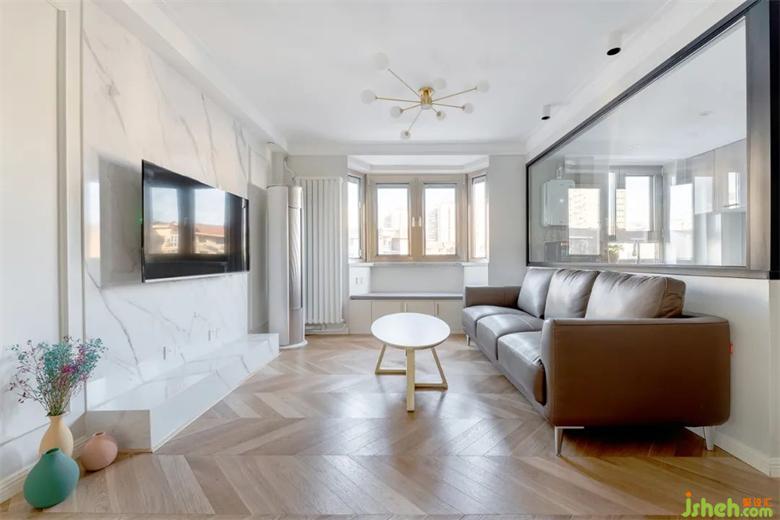 客廳窗戶位裝修設(shè)計置是突出去的,利用這個凸角做了卡座,形成客廳的一部分作為休閑區(qū)。電視背景選用石材,因為電視這面墻要長于沙發(fā)后面的墻體,便把電視位置做了調(diào)整,使背景和沙發(fā)在視覺上居中。