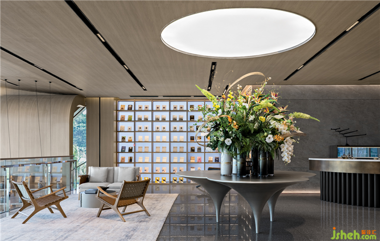 二層以挑空架構形成層高優(yōu)勢,巨幅的落地窗把室外的光與景納入室內,景色宜人。營銷中心設計大幅的展示架組成立面貫穿整個空間,開放性的大空間規(guī)??涉敲郎鐓^(qū)圖書館。