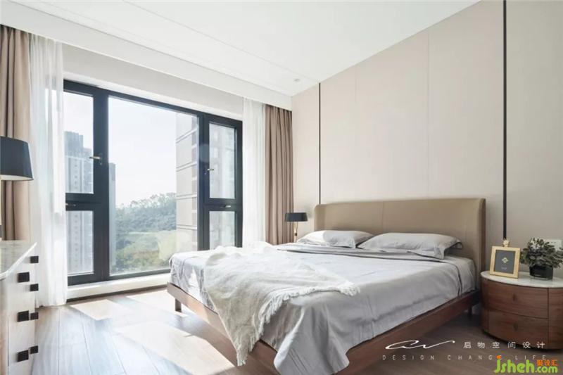 在塊面與線條中,用一點床頭柜的圓活潑主臥空間。