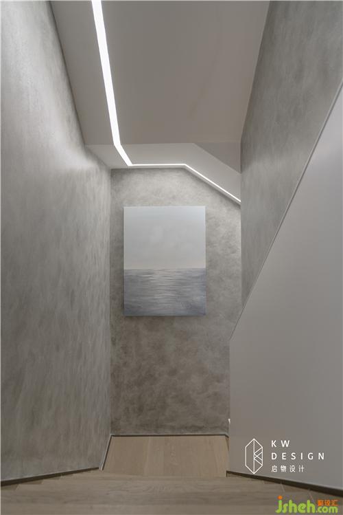 樓梯以水泥灰的藝術(shù)漆與空間區(qū)分開,同時作為上下空間的過渡。木地板的溫潤通鋪踏步至二樓各空間。