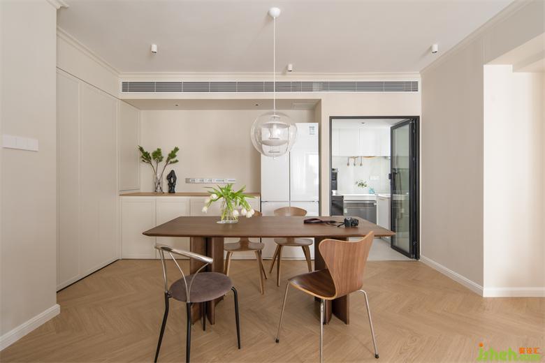 餐廳與廚房砌了一面薄墻使餐邊柜和冰箱呈內(nèi)嵌狀態(tài),景新花園家裝設(shè)計削弱收納的厚重體量,同時也拓展了廚房的徑深騰挪出折疊推門的收納位置,而不影響廚房的正常使用。