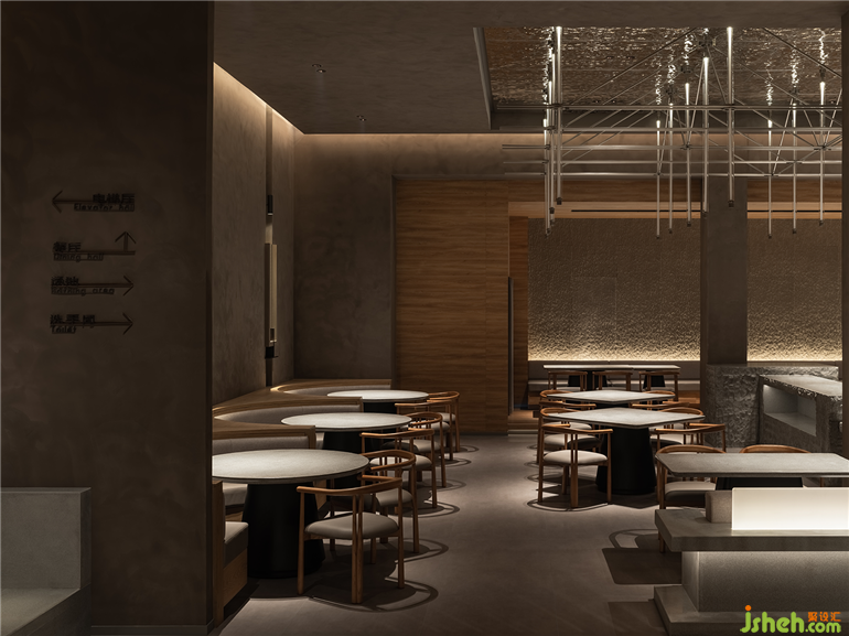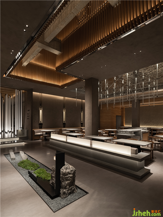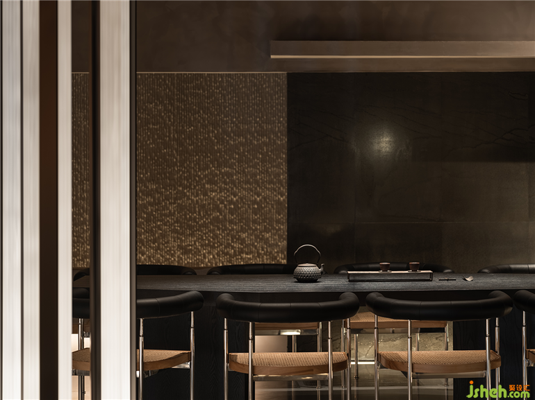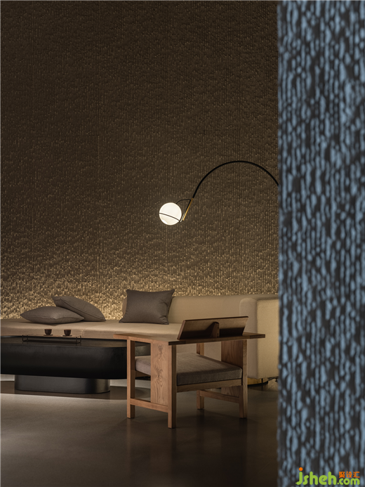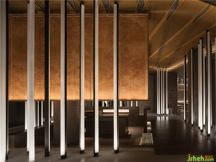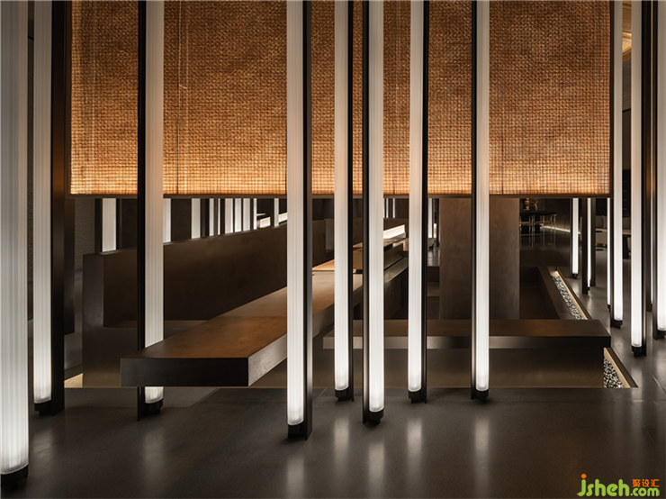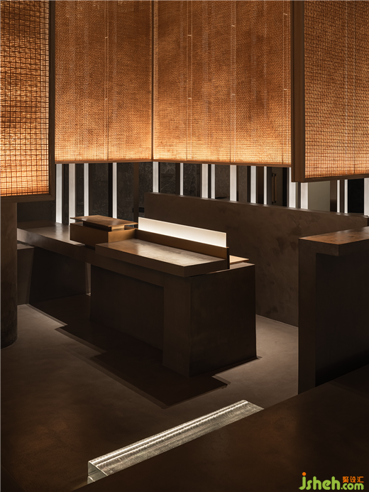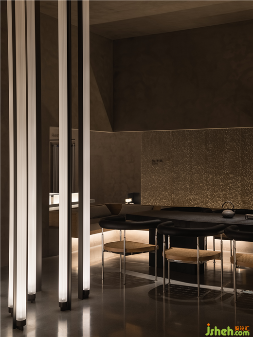 和子SPA會館設(shè)計被極致抽象的線條,是屬意當代的克制浪漫,于縱橫間流露出文人詩意,想象力編織成圖。一切似是而非,縱貫的燈光如練如瀑,涓流借著光影在流水石上「淌過」,恰如畫中山壁上密如細雨的筆觸(雨點皴)。循級亭心,暖光如月,竹簾空懸。