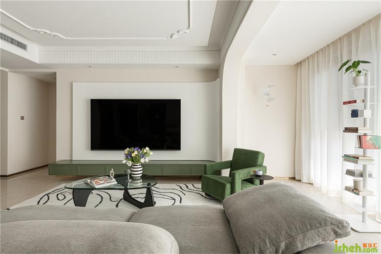 石膏線采用弧形造型呈現(xiàn)出優(yōu)雅柔和的質感,電視背景墻也采用了弧線的延伸作為過渡。整個空間彰顯出弧線元素的靈動與優(yōu)雅。