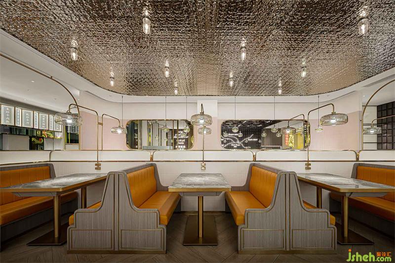 本案港式餐廳設計從新寶餐廳的logo提取元素,以弧形、圓角、矩形的轉化應用,構筑沉浸式的現(xiàn)代港意空間。門頭立體化“S”弧造型有裝置意味,霸道式吸睛,不給人思索余地,卻高度聚焦品牌元素,表現(xiàn)視覺力量。水紋不銹鋼更是形變的弧形之濫觴,在規(guī)則和靈動之間的自由跳躍,躍動的弧形和硬挺矩形碰撞,方中有弧,弧里有方,張弛有度。
