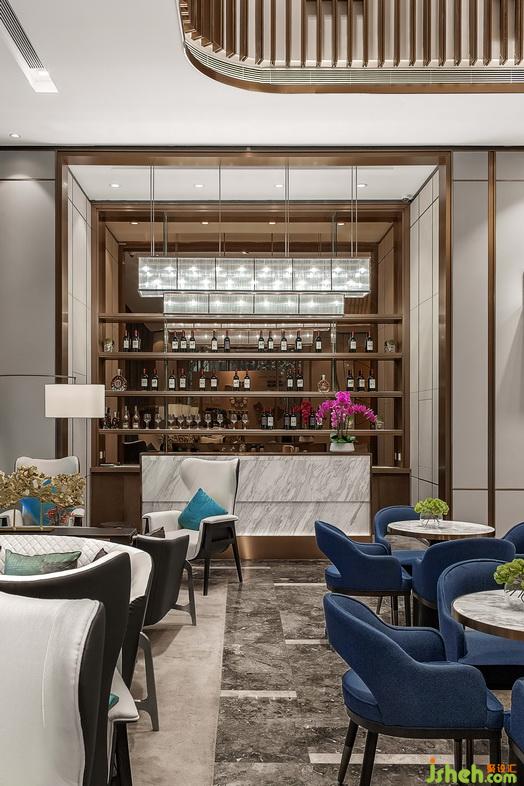 樓梯間采用大理石、玻璃與鋼材的結合,簡潔現(xiàn)代。錯落有致的玻璃燈飾垂于中央,盤旋樓梯而上時,星星點點,美不勝收。洗手間橢圓造型的圍合形態(tài)營造出空間的通透性,隔而不斷。