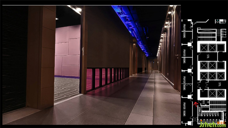 十字架的造型,其中一個(gè)面是凹進(jìn)去,左上用白光,右下用藍(lán)光,使得十字架里面的石頭更加具有立體感,讓這個(gè)位置變成一個(gè)景。教堂的過道兩邊各有六塊玻璃,上面刻上一些文字,玻璃背后用LED白燈和藍(lán)燈,使得玻璃上的文字可以凸顯出來,不需要靠的很近也能看清楚上面的文字。教堂位置選用的是條行地毯,對應(yīng)頂上的燈光,換不一樣顏色的燈光地毯也會(huì)相對應(yīng)的改變顏色。