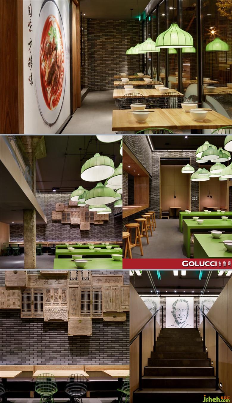 而李先生的核心價值主題是從專業(yè)、經(jīng)典、健康的牛肉面大王出發(fā)。再次用顧客群的角度去思考,得出年輕人愛吃牛肉,他們熱愛健身、認為牛肉是有力量的、崇尚健康,他們喜歡陽光、活潑等,這些都是產(chǎn)品的定位。設計方面李先生案例的采用雨棚造型的門頭,底面可以是燈箱,更加洗亮外立面。餐廳設計空間上借鑒了的美國的漢堡店布局,裝飾面材料又充滿了中國語匯,期待透過這種碰撞給顧客提供獨特有趣的用餐體驗。而卡座背后的墻面,利老師將木飾面高度提高,裝飾畫高度減少,加上黑色的金屬框產(chǎn)生一個細長的窗口,窗外是一望無際的抽象牧場草原。同時,灰綠色的畫面與芋之遇的綠色相互呼應,整個空間更加協(xié)調(diào)統(tǒng)一。