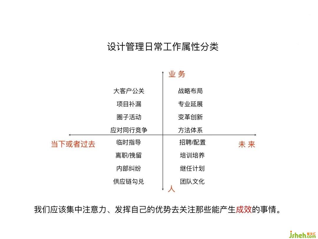 這個(gè)是我做的關(guān)于一個(gè)設(shè)計(jì)公司管理者的日常工作屬性分類。為什么大家現(xiàn)在會(huì)對(duì)未來充滿迷茫和焦慮,是因?yàn)槲覀冏鳛楣窘?jīng)營者把更多的精力放在了過去和當(dāng)下,而沒有立足于未來去做布局。