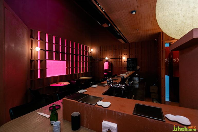 這餐廳空間狹小,共12個餐位,吧臺像一把簡單精致直角扳手,長柄處坐6個人,拐個角,短的一頭設(shè)兩個餐位。外立面墻中間有一個玻璃窗戶,窗戶底下左右兩張桌子,4個餐位。白天光打進來薄薄一層鋪在25%透明度的玻璃上,像粉紅色的霧。晚上的模樣我們不知道,可夜色撩人,霧色應(yīng)更濃。
