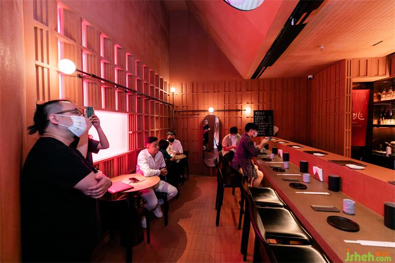天上的云遲遲不徹底暗下來,始終看不到夜里的景象。餐廳內(nèi)部結(jié)構(gòu)與設(shè)備,使人覺得想象力正是要此刻發(fā)力,餐位之間緊湊,拉近了人與人之間的物理距離,水磨石表面接近自然的陶土色,散出親和感。餐廳內(nèi)所有的燈的光幾乎都是暈開的暗紅色,輕輕柔柔,仿佛在這餐廳里的每一夜都能等來莎士比亞光顧。