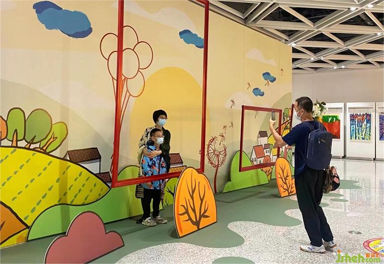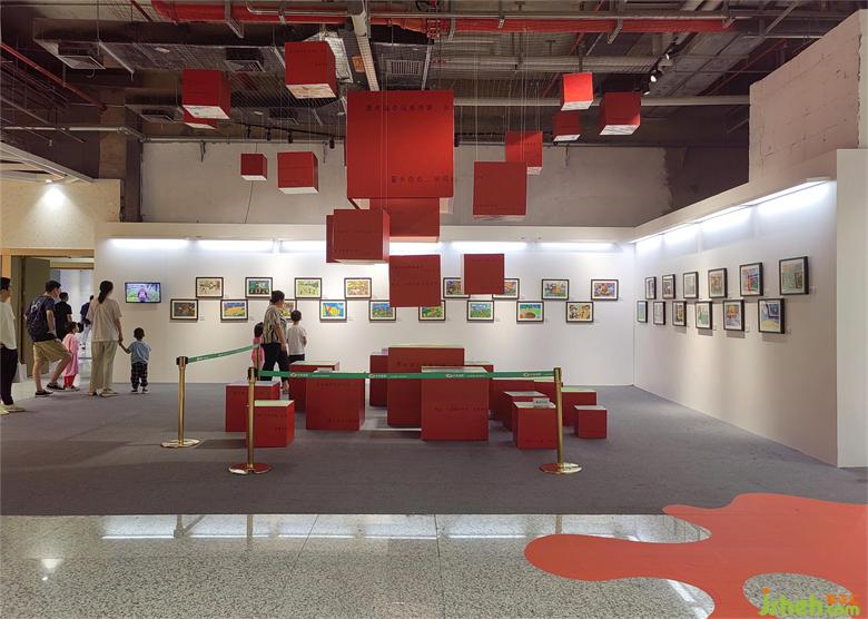 紅色的裝置藝術(shù)點綴在畫展區(qū)域中心,一組大小不一的盒子從天而降,每個盒子底部為孩子們的畫作。地面上放置的另一組裝置,盒子的頂部是孩子們的畫作,與天花上落下的盒子遙相呼應(yīng),形成了一個自然融合的整體。盒子的周邊展示的是孩們手寫的話語,展示了他們天真無邪、快樂自由的生活態(tài)度。
